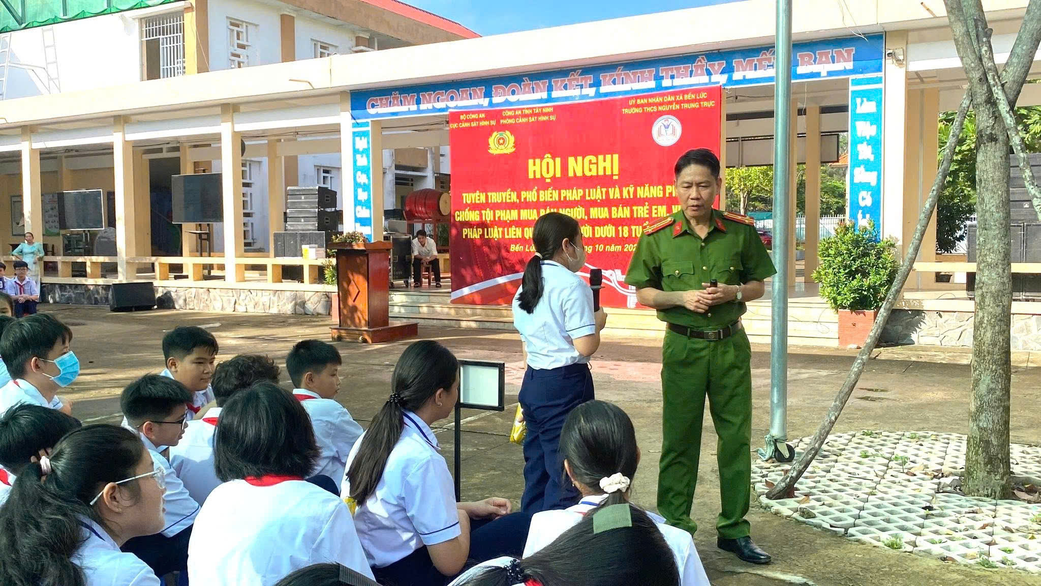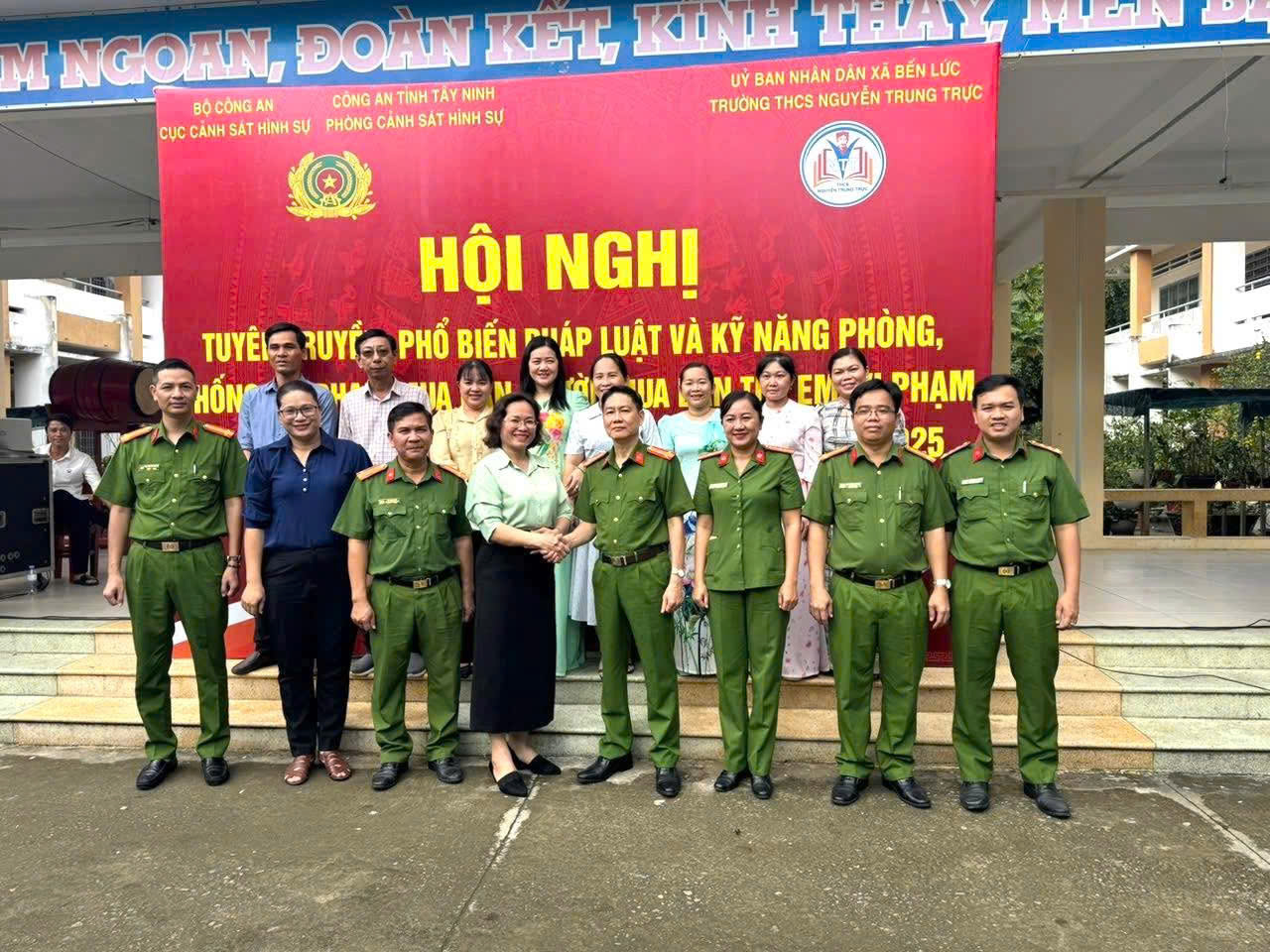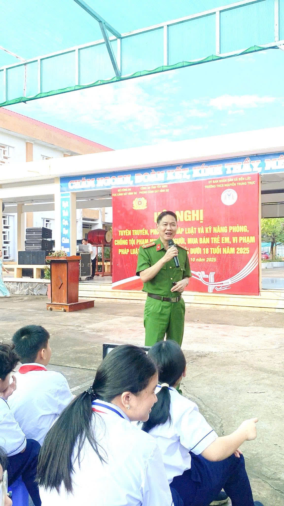 Sáng ngày 31/10/2025, Phòng CSHS Công an tỉnh Tây Ninh phối hợp Cục CSHS Bộ công an tổ chức buổi tuyên truyền, phổ biến kiến thức pháp luật và kỹ năng phòng, chống tội phạm mua bán người, mua bán trẻ em, cùng các hành vi vi phạm pháp luật liên quan đến người dưới 18 tuổi tại trường THCS Nguyễn Trung Trực.